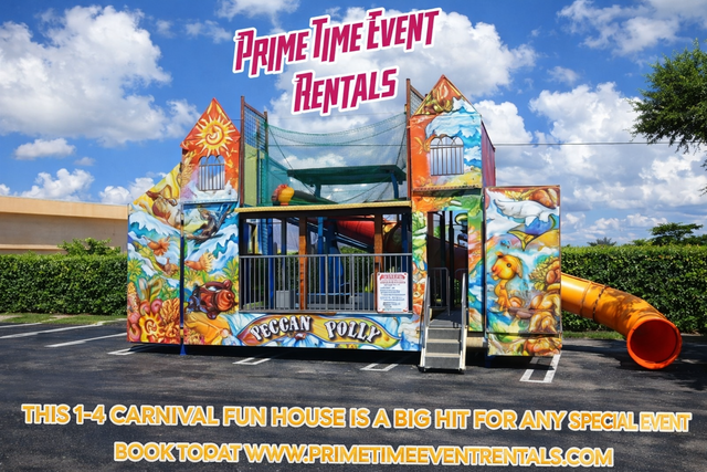 This is a real deal carnival attraction, The Fun House is fun for the whole family with 2 stories of none stop fun with over 15 different obstacles to go through and over, crossing a Swaying Bridge and Sliding Down the curve tube slide, this is a cool ride for all your special events and festivals.. All Mechanical Ride Include: Rider Limit Per Ride: 12 Trained Operator:1 Electrical Cord: 1x 100' Cord Additional: 50' Electrical Cords $10.00 Each Space Required: 25W 35L 17T Electrical Needs:1x 20 amps Anchors: No Stakes Required Outdoors. Anchors: No Stakes Requiered Indoors Can Set Up on Most Grounds. FREE Set-Up FREE Local Delivery Route. Travel Fees Apply Out Of Delivery Area